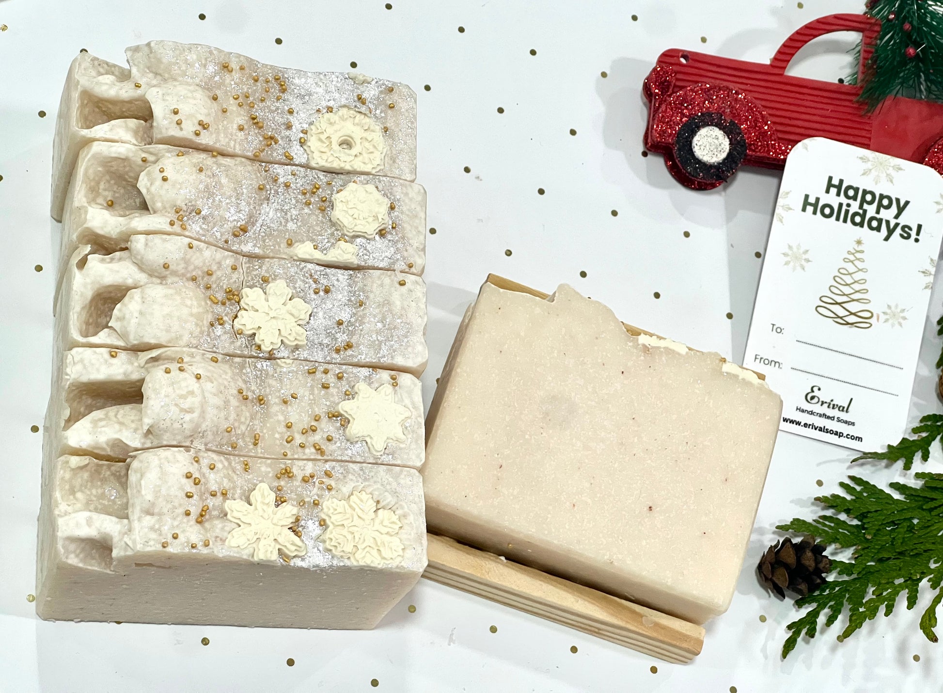 Ingredientes: Aceites saponificados de aceite de oliva extra virgen, aceite de coco, manteca de karité, aceite de arroz, aceite de aguacate, aceite de ricino, micas cosméticas natural color, sal del himalaya rosada, dióxido de titanio, arcilla blanca, fragancia libre de parabenos, en el tope cuencas de aceites doradas y copos de nieve de jabón.